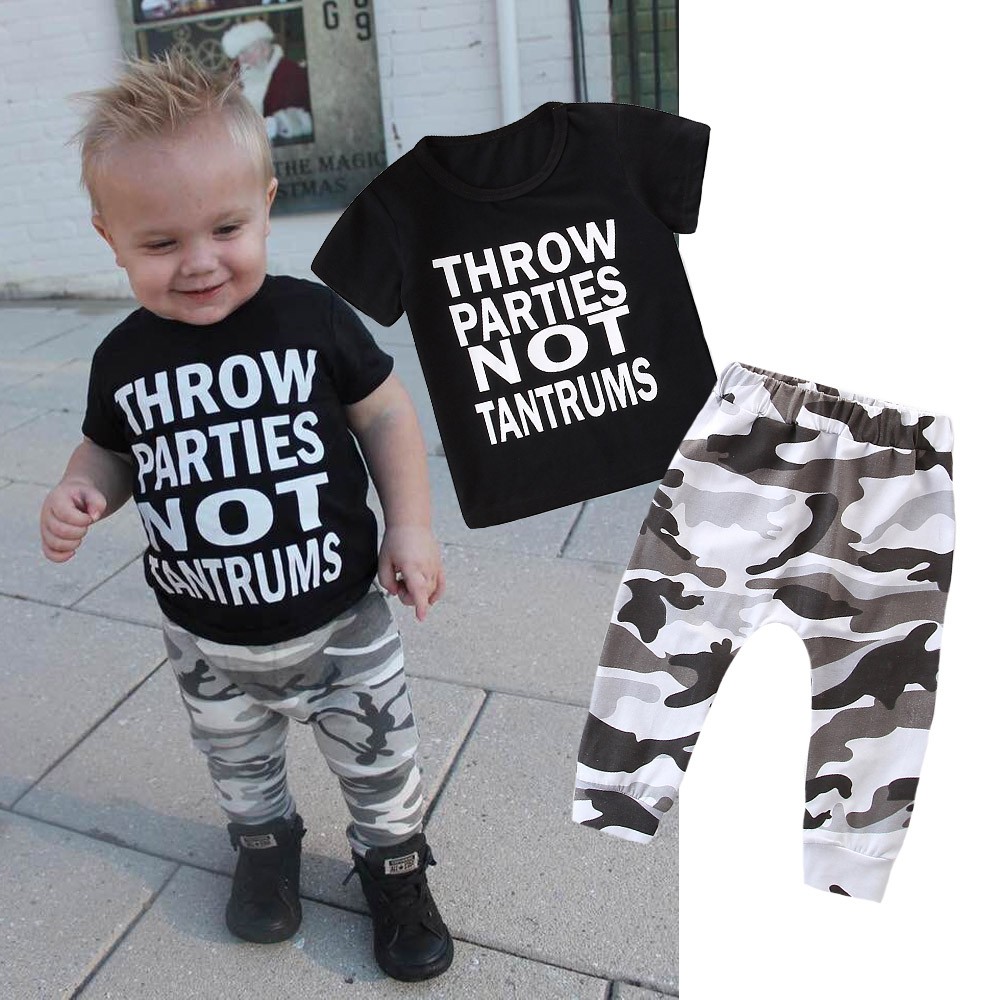 Boys Clothing Set Black Letter T Shirt Tops Camouflage Pants 2pcs