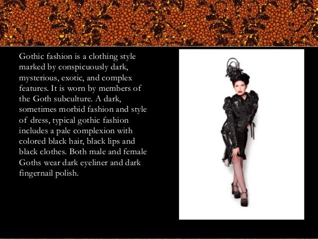 All of these edgy styles come with their very own staples. Male goths use cosmetics at a higher rate than other men. Dress typical gothic fashion includes dyed black hair dark lipstick and dark clothing.