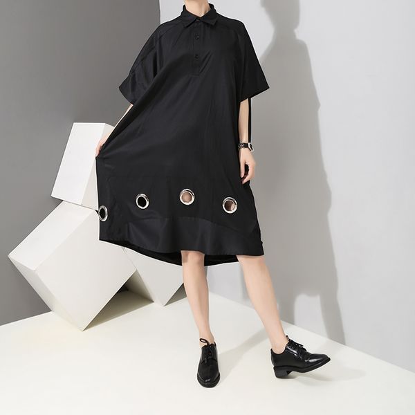 New 2019 Korean Style Women Summer Black Shirt Dress Metal Holes